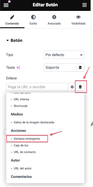En el enlace del botón, en lugar de añadir una URL haz clic en el icono de “Etiquetas dinámicas”, desplázate por el desplegable y en Acciones elige la opción “Ventana emergente”. Ahí tendrás que seleccionar el popup que has diseñado en el Paso 1 de este tutorial.